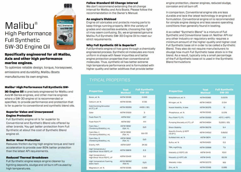 Developed for Malibu and Axis M-Series engines, and ideal for any marine engine where 5W-30 is recommended or specified, this oil offers performance and protection far beyond conventional and synthetic blend alternatives.